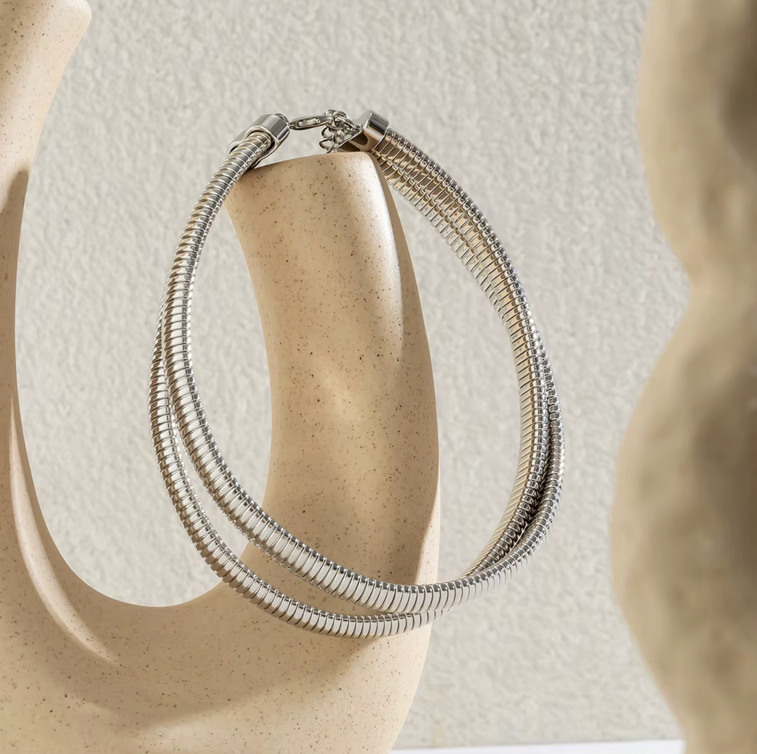 Regulärer Preis CHF 40.00Verkaufspreis CHF 40.00 Regulärer PreisEinzelpreis / proin Statement der puristischen Eleganz: Dieses Halsband vereint architektonische Klarheit mit organischer Anmut. Seine fließenden Linien schmeicheln der Silhouette, während die präzise verarbeiteten Details eine unaufdringliche...