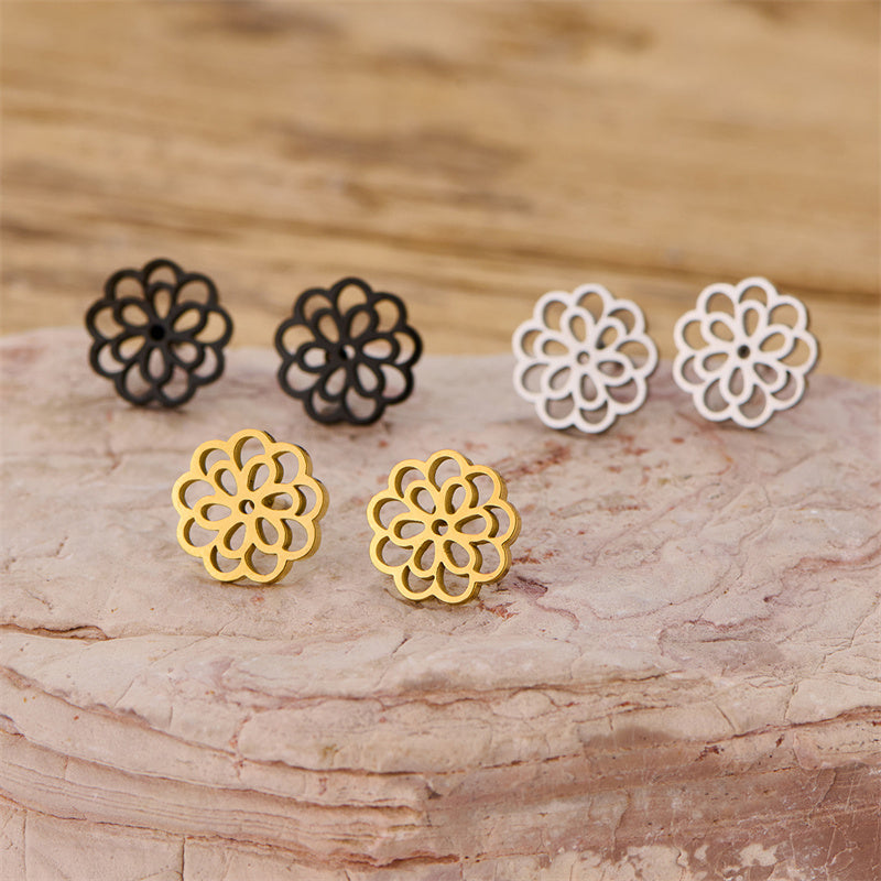 Zart und verspielt: Die „Floral Cut“-Ohrstecker überzeugen mit einem eleganten, floralen Ausschnittdesign und sind in drei Farben erhältlich – Gold, Silber oder Schwarz. Die filigrane Blütenform macht sie zu einem charmanten Alltagsbegleiter oder einem dezenten Hingucker für besondere Anlässe.