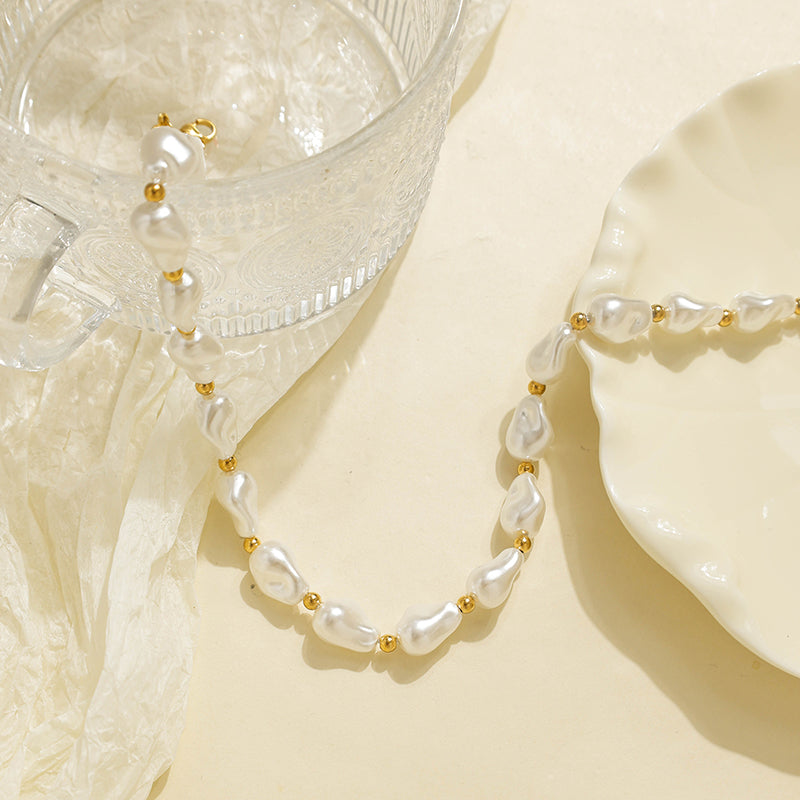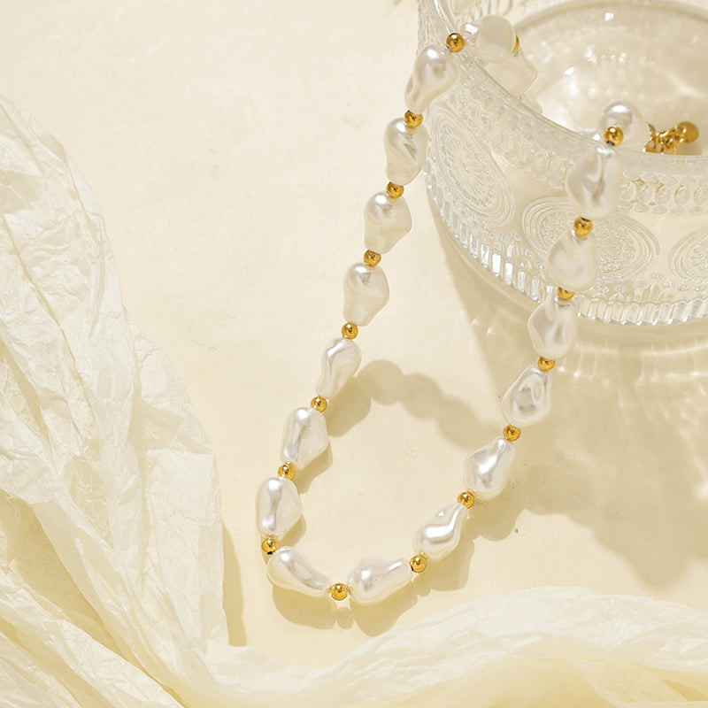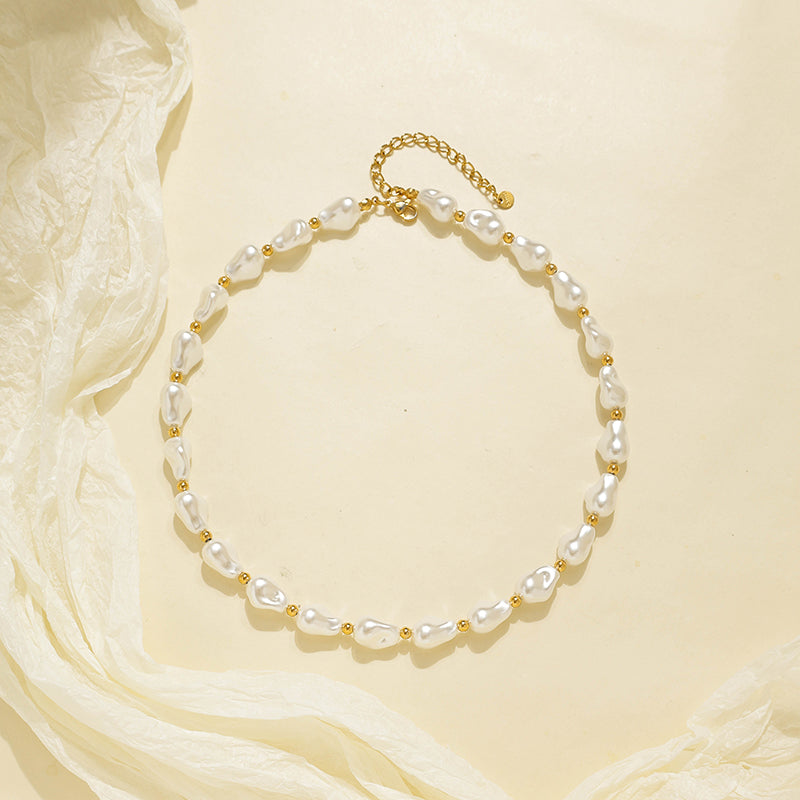 Diese zauberhafte Halskette vereint klassische Schönheit mit modernem Flair. Unregelmäßig geformte Kunstperlen wechseln sich harmonisch mit feinen goldfarbenen Kugeln ab – ein Look, der zeitlos und gleichzeitig trendbewusst wirkt.